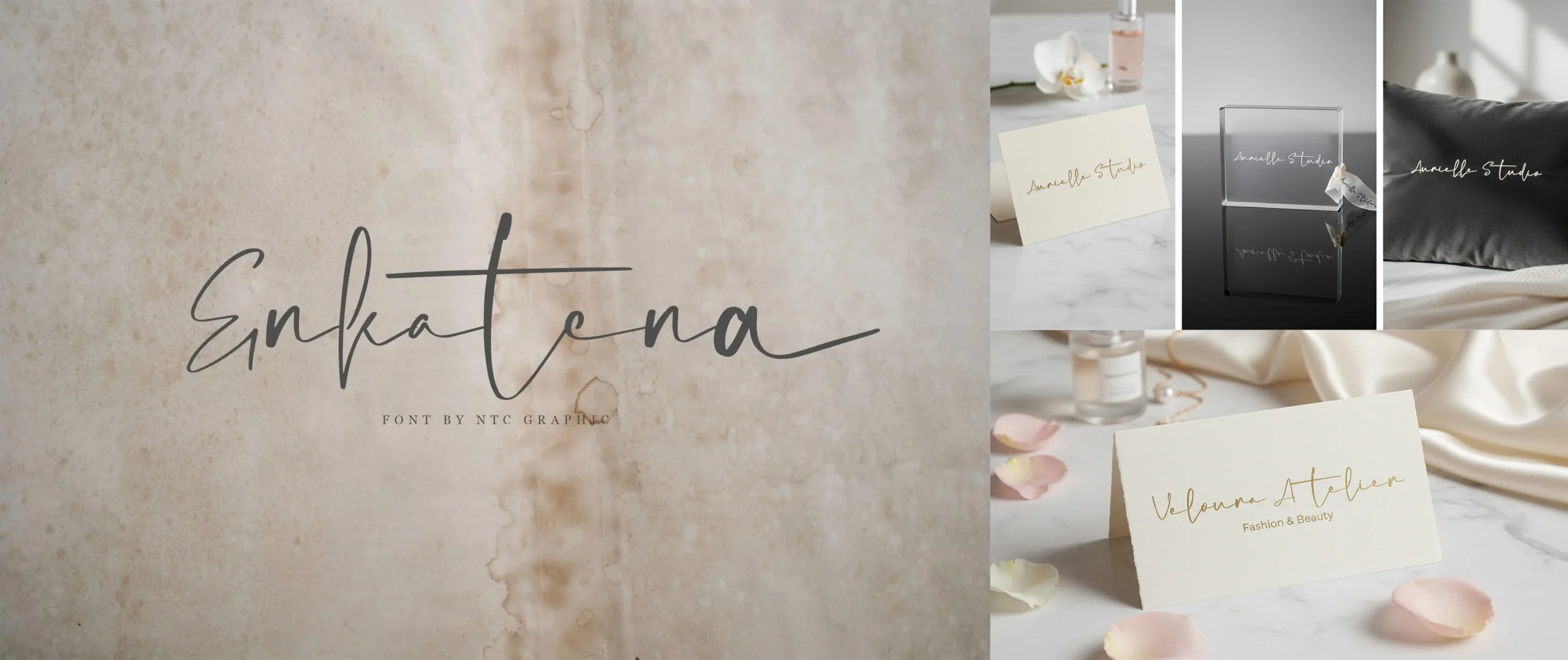 Enkatena is an elegant signature script font designed to deliver a refined and luxurious handwritten look. Each letter is carefully crafted with smooth strokes and unique curves, creating a natural yet premium feel. This font is perfect for fashion brands, beauty products, wedding designs, personal branding, and high-end logos that want to look classy and exclusive.