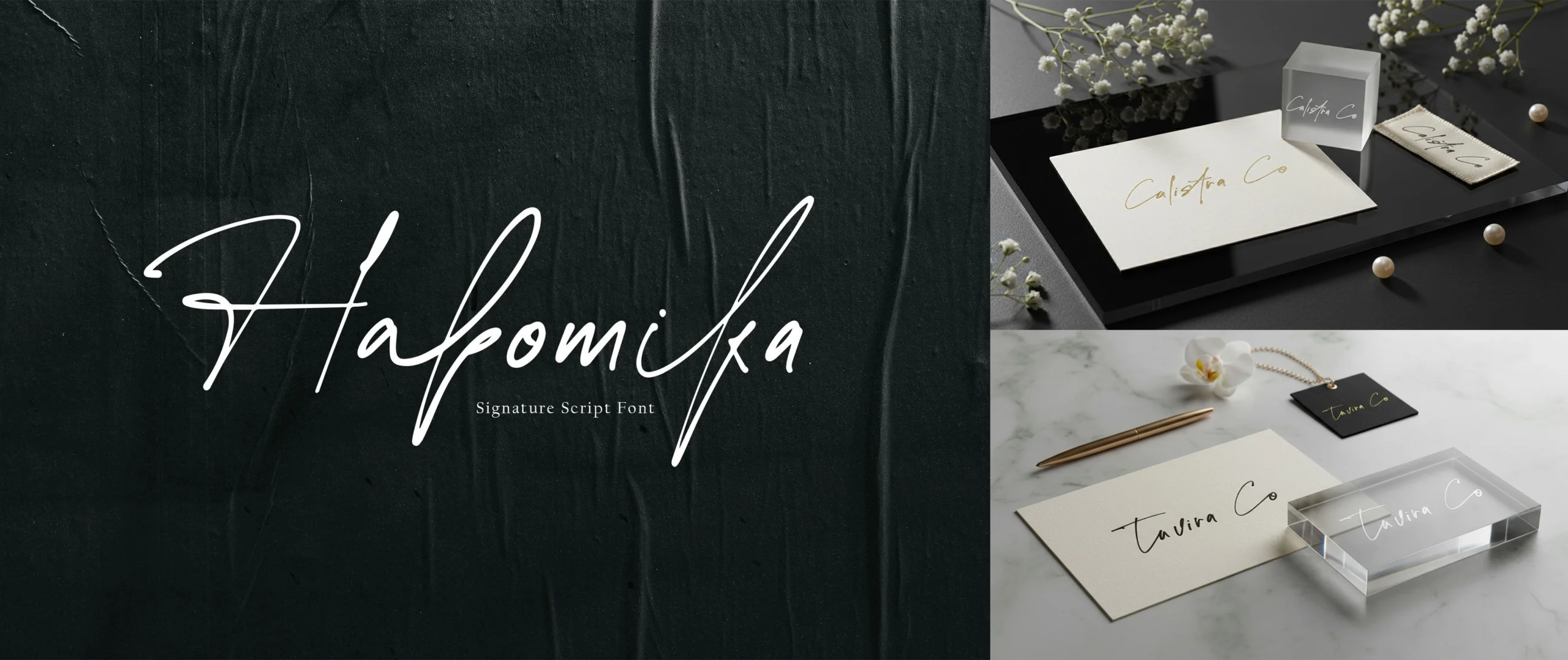 Habomika is a stylish signature font with beautifully shaped characters that feel natural and expressive. Its flowing strokes and balanced spacing make it ideal for logos, packaging, skincare brands, boutique labels, and creative businesses that want to appear elegant but still friendly and modern.